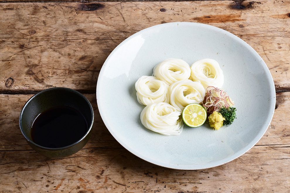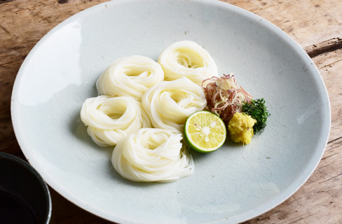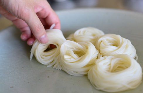 料理ののっていない余白部分を多く残せるサイズを選びます。 余白をいっそう広くとることで、涼し気で豪華な印象になります。 水の中にあるそうめんを、指1本でたぐるようにして引き上げ、 人指し指と中指の二本に巻きつけたものを器に盛ります。