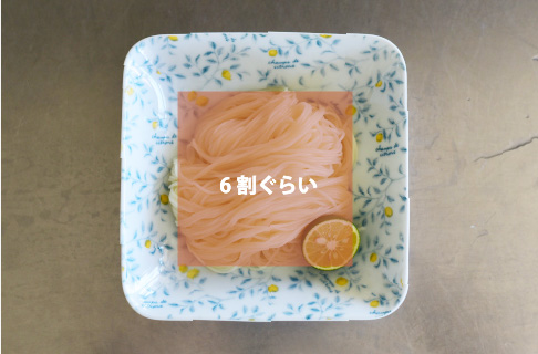 料理ののっていない余白部分を4割程度残せるサイズを選びます。 余白を広くとることで、すっきりと涼し気な印象になります。 水の中にあるそうめんを、指1本でたぐるようにして引き上げると、ある程度揃えることができます。