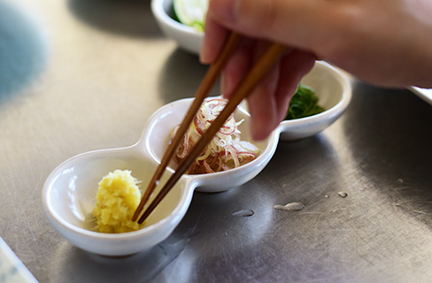 薬味はあらかじめ山型に整えてから器の中央に置くときれいに盛りつけられます。