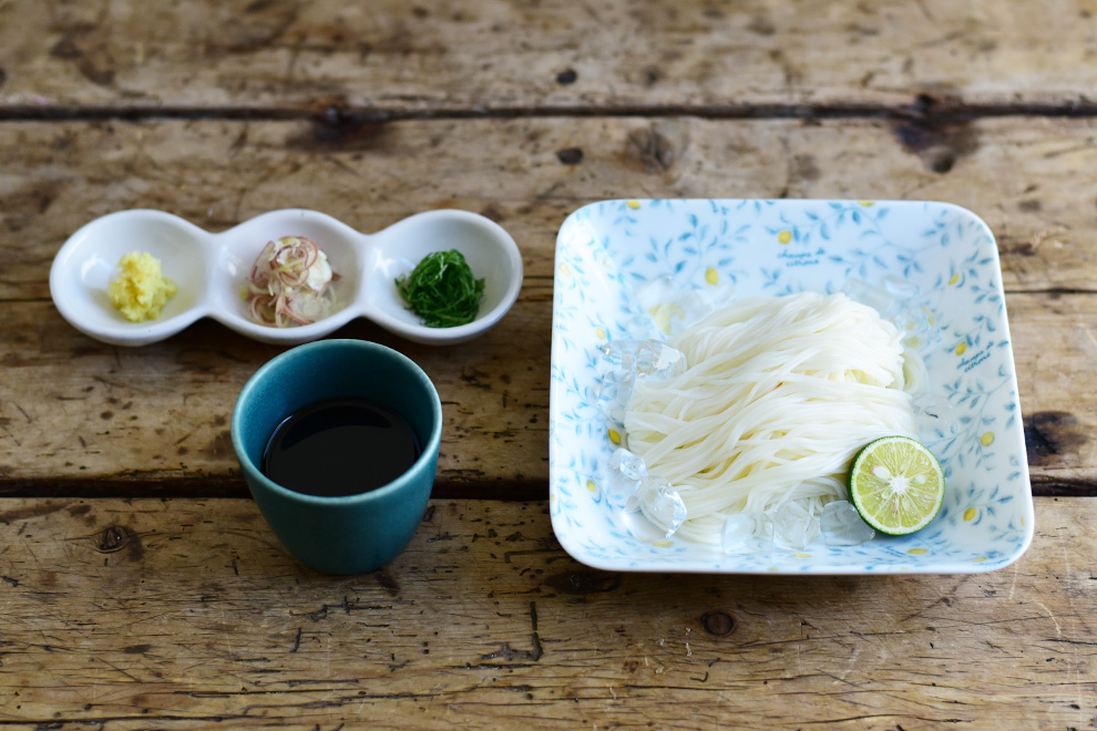 薬味はあらかじめ山型に整えてから、そうめんの手前に添えます。 数種類ある場合は奥を高く、手前を低くすると見栄えもよく食べやすいです。