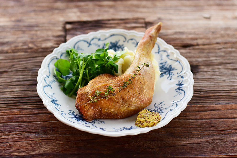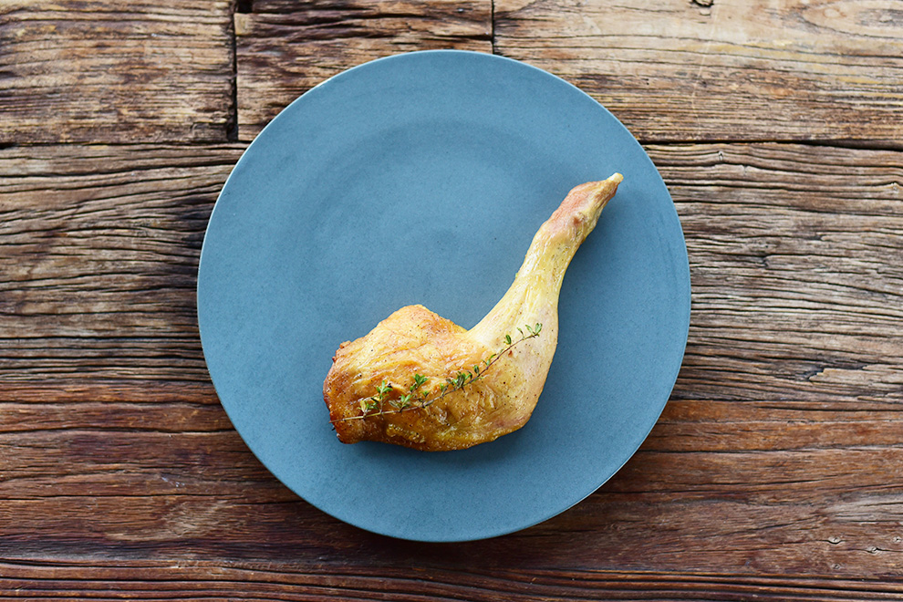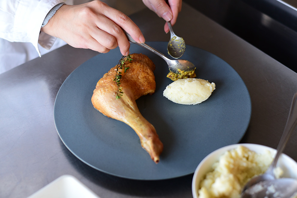 ひと品ごとの余白を広めにとれる様にチキンを盛ります。 付け合わせも整然と並べ、印象を合わせるとバランスが良くなります。 フラットな器を選ぶことで料理の立体感が際立つ効果も。