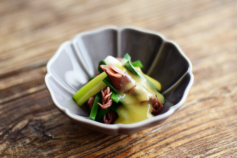 わけぎの色やホタルイカの色を残し、部分的に酢味噌をかけることで彩りが良い仕上がりに