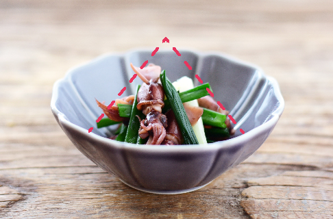 盛りつけの最後にのせる飾りのことを「あしらい」といい、季節のものを飾ります。 あしらいがのっていると「この料理にはまだ箸をつけていません」という証にもなります。