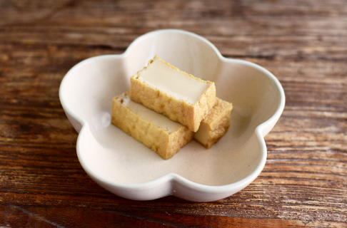 ふきを立てかけるように盛り、厚揚げの方を少し高くすると食べやすくなります。