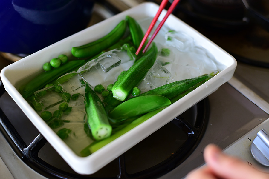 豆類、アスパラ等はさっと茹で、氷水で冷まし色良く仕上げます。