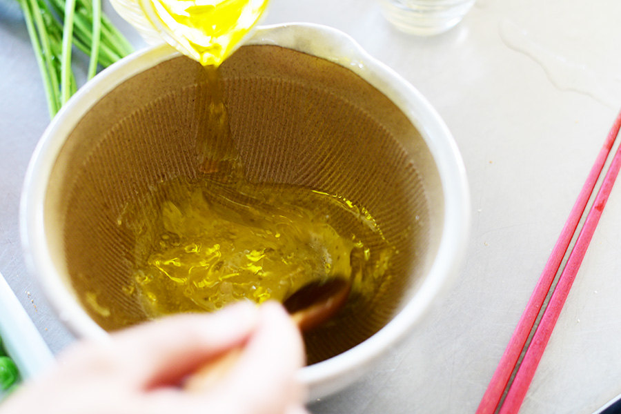 にんにくとマスタード、ワインビネガー、オリーブオイルを混ぜ合わせたドレッシングを添えます。