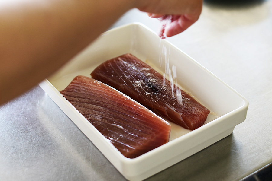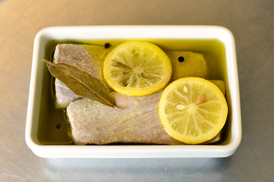 余分な水分を取り除いたマグロをレモン、ローリエ、オリーブオイルと一緒に