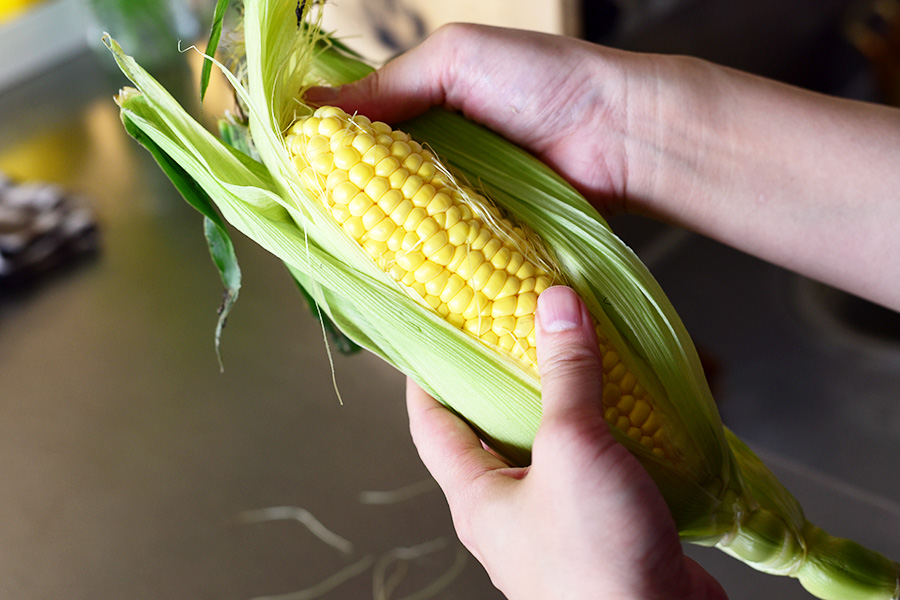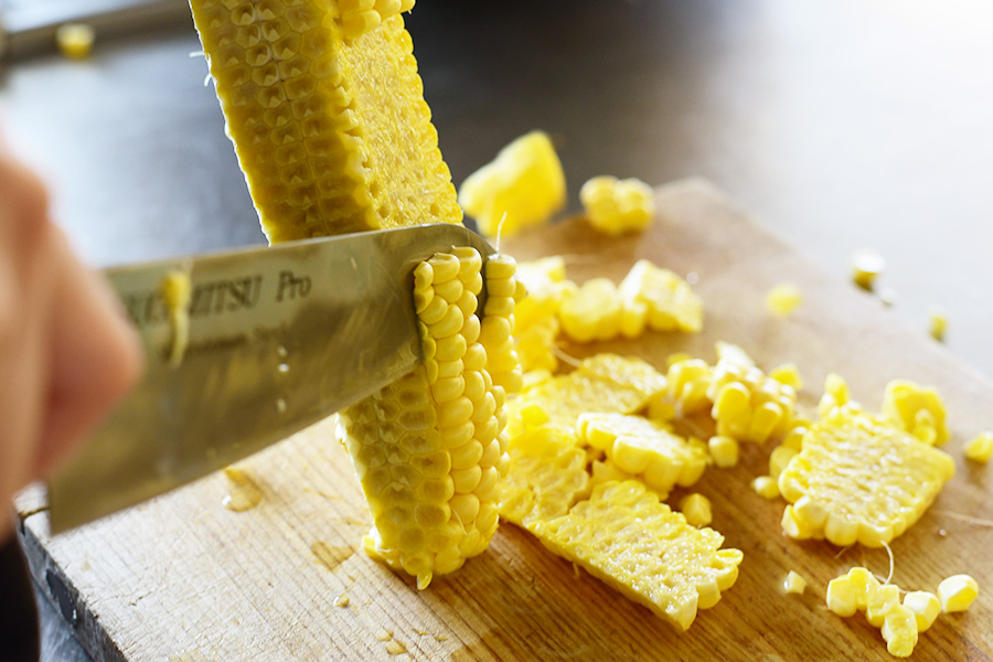 生のとうもろこしを芯からそぎ落とし玉ねぎと一緒にスープにします。