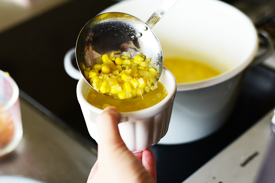 蓋付きのカップにとうもろこしのスープを注げば、手軽なメニューも楽しい気分で楽しめます。