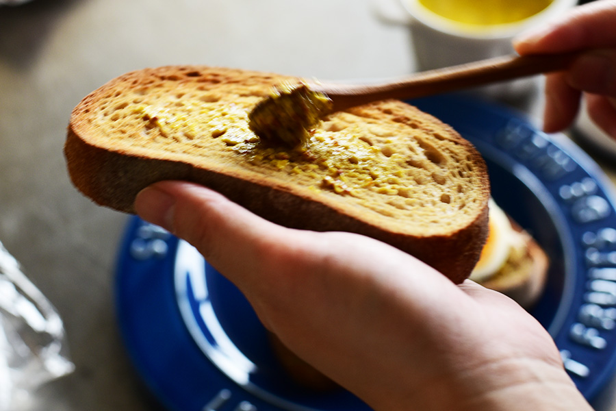 ライ麦パンは香ばしくトーストし、バターと粒マスタードを塗っておきます。