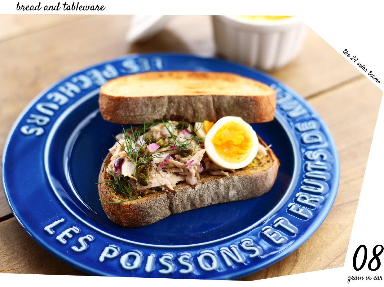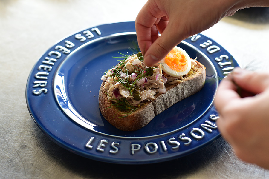 自家製ツナはざっくりとほぐし、ワインビネガーと漬け込んだオイルで味を整えます。