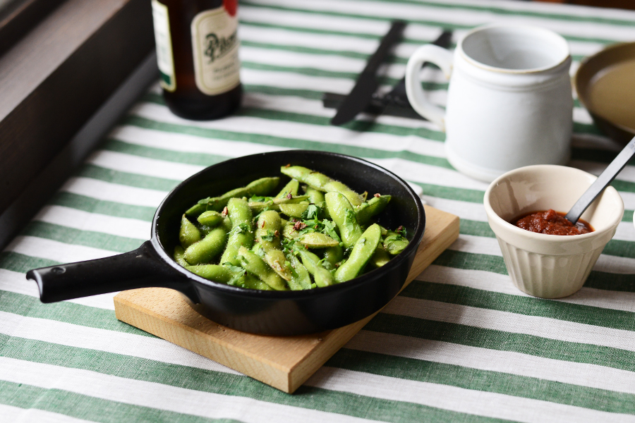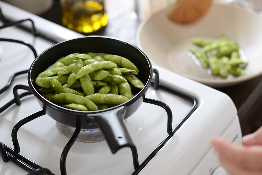 陶製フライパンでにんにく、花椒などのスパイスを炒めたら、生の枝豆を入れ蒸し焼きにする。 このままテーブルに運べばにぎやかな雰囲気に。