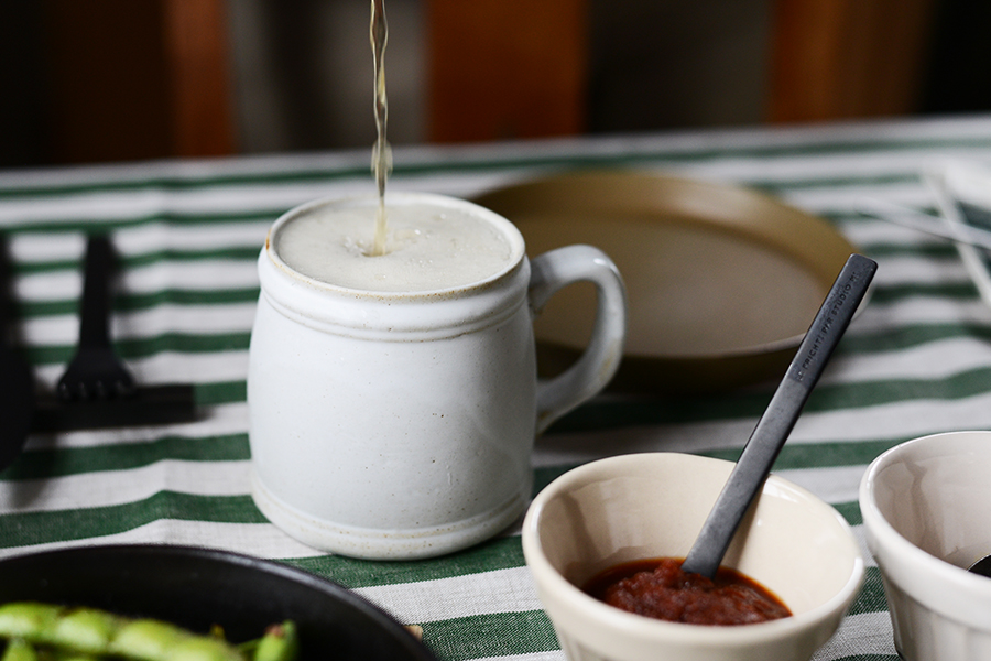 どっしりとした愛嬌のある形が特徴の陶製のジョッキ。 陶製ならではの口当たりが優しく、美味しいビールが楽しめる。