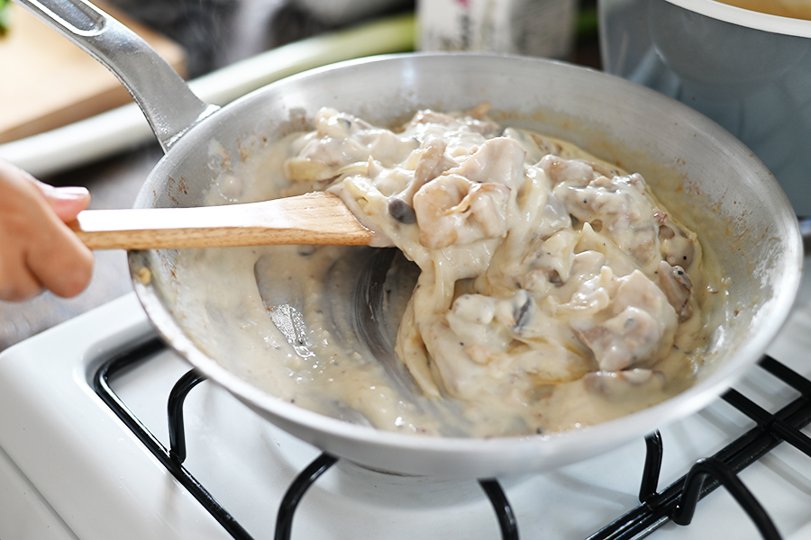 バターで炒めたきのこと玉ねぎに小麦粉を振り入れてしっかり火を通し、牛乳を加える。 フライパンひとつで手軽にきのこ入りホワイトソースを作る。