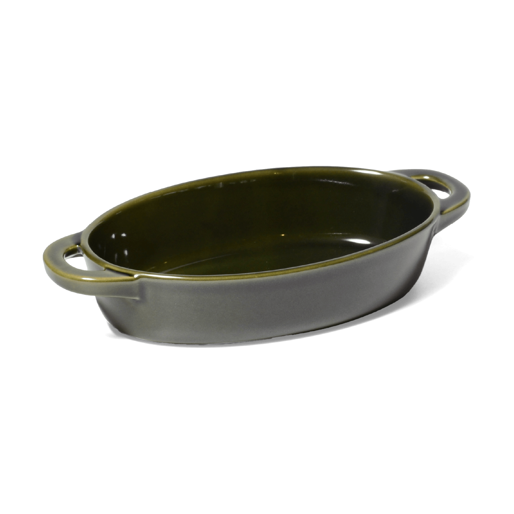 シックなブラウンとグリーンのグラタン皿はクリーミーなグラタンがよく映える。 オーバルのシンプルな形状に小さなハンドルがアクセント。