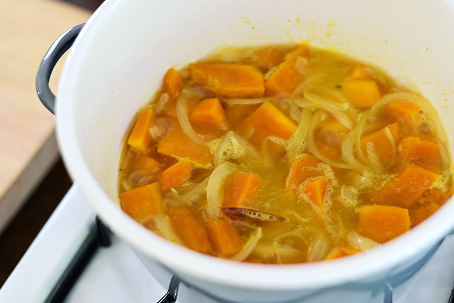 バターで炒めた玉ねぎとかぼちゃにブイヨンを加え、 柔らかくなるまで火にかける。 ミキサーで滑らかにしたら、牛乳を加えて味を整える。