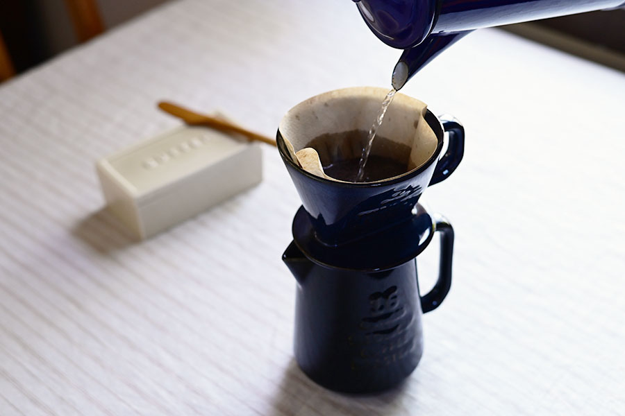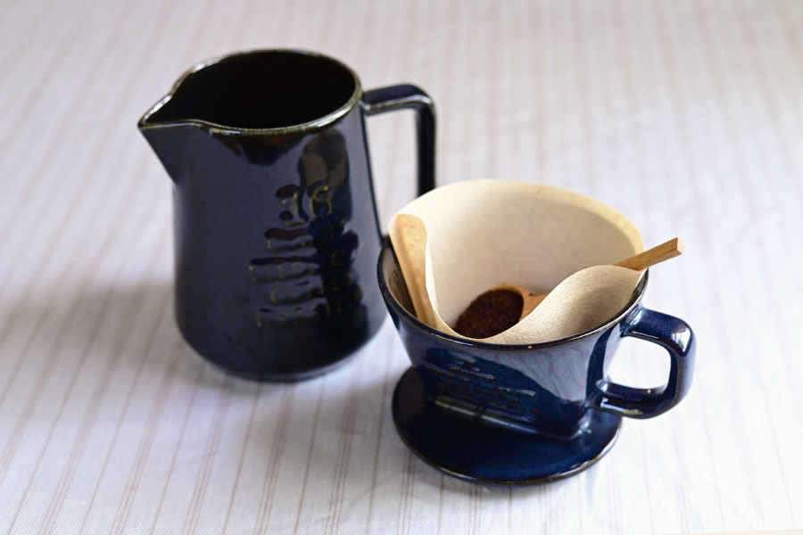 ハンドドリップで香りのよいコーヒーを淹れる。 無骨でヴィンテージ感あふれる陶製のドリッパーとピッチャーのセットで。