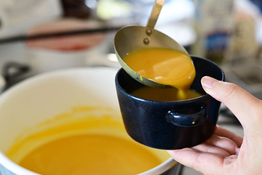 じんわりと温かさが伝わる陶製のスープカップ。 濃いネイビーの色合いで、黄色いかぼちゃの色がよく映える。