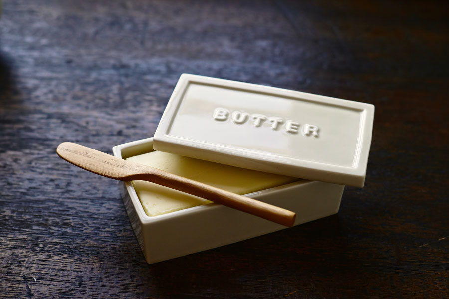 陶製のバターケースは凸のロゴがポイントで、200gのバターがそのまま入る。 ぽってりと厚みのある質感で、懐かしさと温かみが感じられるデザイン。