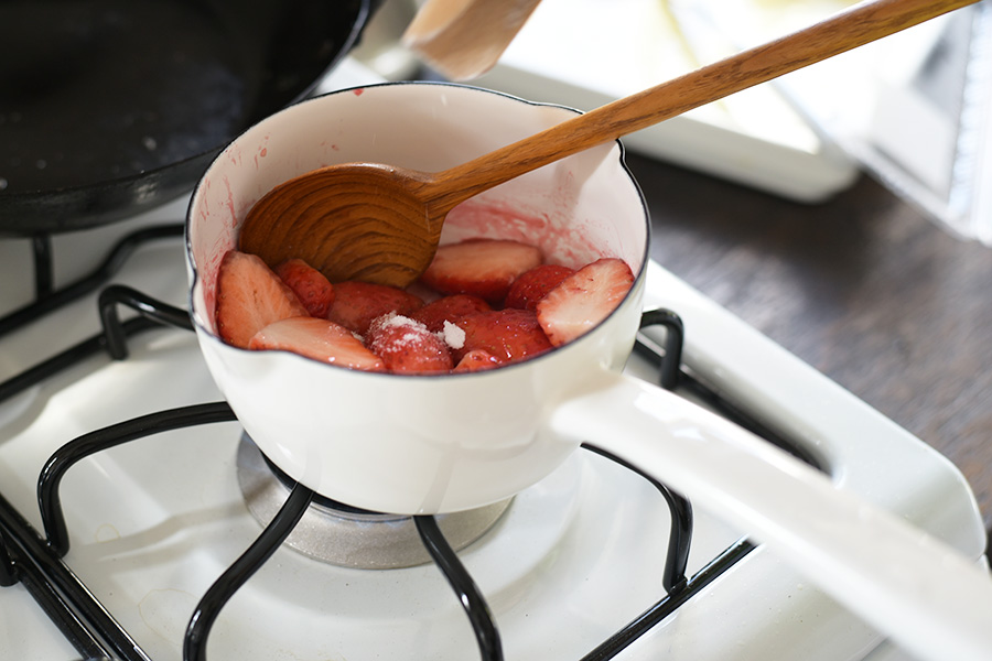 いちごやブルーベリーなどの果物を洗ってそのままテーブルに出す。じゃがいもや人参を茹でさっとボウルに移して、温かいうちに頂く。豆腐やヨーグルトの水切りをしてサラダを作る。キッチンでもテーブルでも重宝するアイテムです。-->いちごは生のまま食べたり、ジャムにしたり。 いちごのかわいい姿や香りを楽しみながらの料理は癒される。 今日はさっと煮た、いちごのコンポートをフレンチトーストと一緒に味わう。