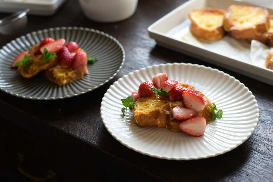 焼きたてのフレンチトーストをのせたら、いちごのコンポートとミントを。 盛り付けたのは放射状に入ったレリーフが美しいプレート。 優しい色合いとつやのある質感で、中央に盛った料理を引き立てます。