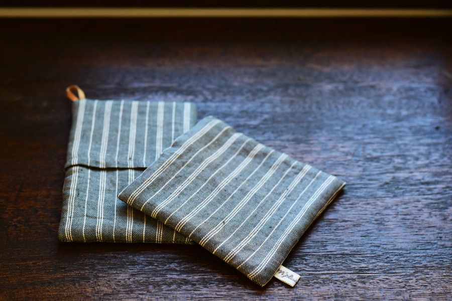 綾織りのリネンで作られた鍋つかみは柔らかく手馴染みがいい。 鍋を食卓に運んだり、食卓に置く時に下に敷いたり。ご飯鍋とのコーディネートを楽しむ。