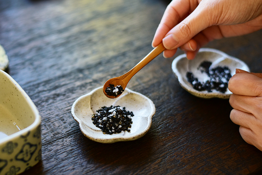 炊いている間に梅の花を象った豆皿にごま塩を。まだ寒さが厳しいけれど梅の花が咲くのももうすぐ。 小物をつかって食卓に季節感を出すのは楽しい。