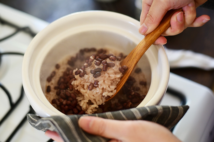 土鍋で赤飯を炊く。