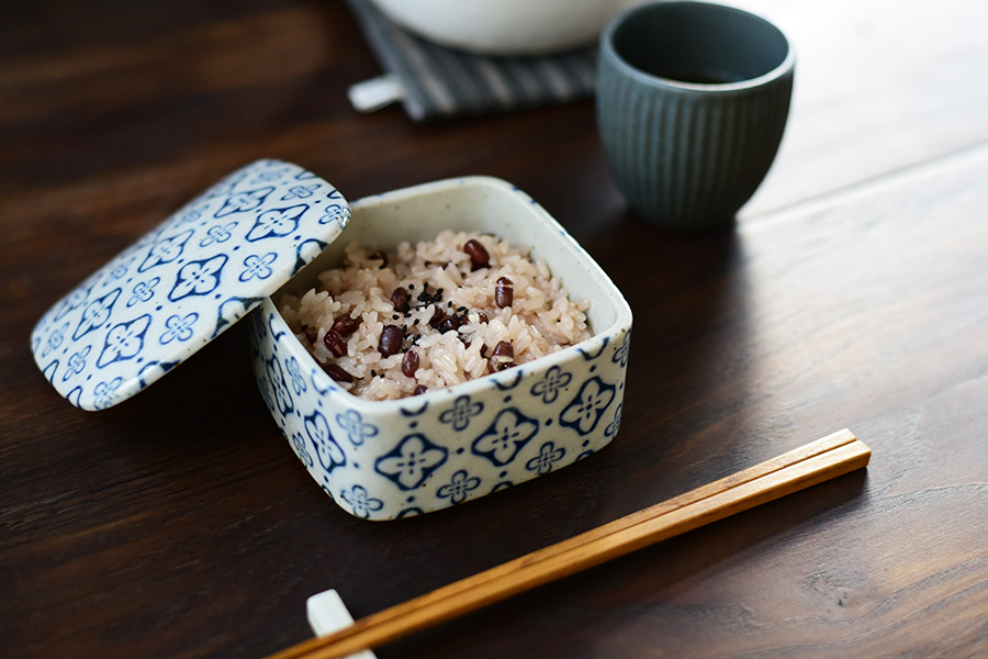お祝いの雰囲気を楽しみたくて小花柄のお重に盛りつけて。 古典的で素朴な模様のお重はお赤飯を特別なひと品に格上げしてくれる。