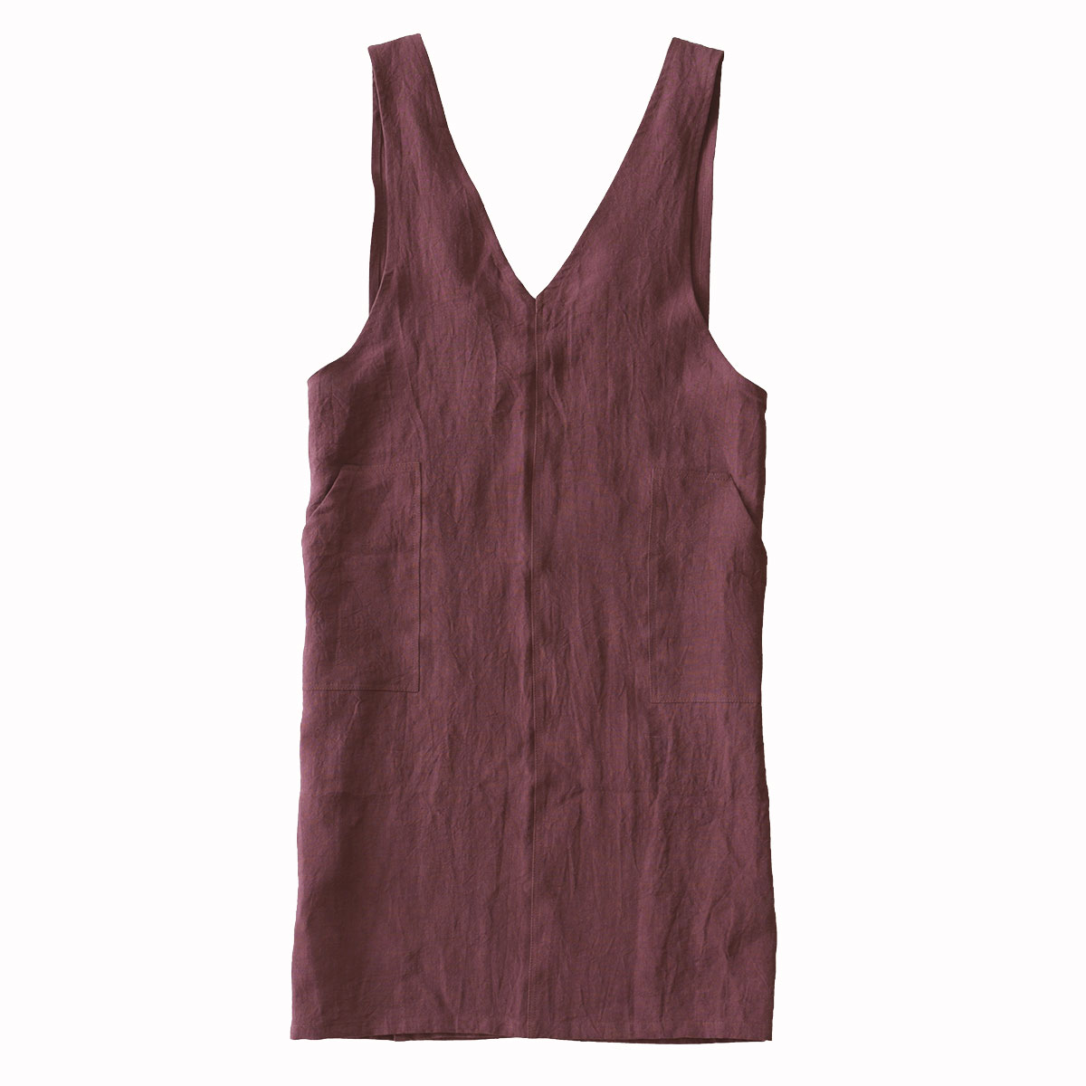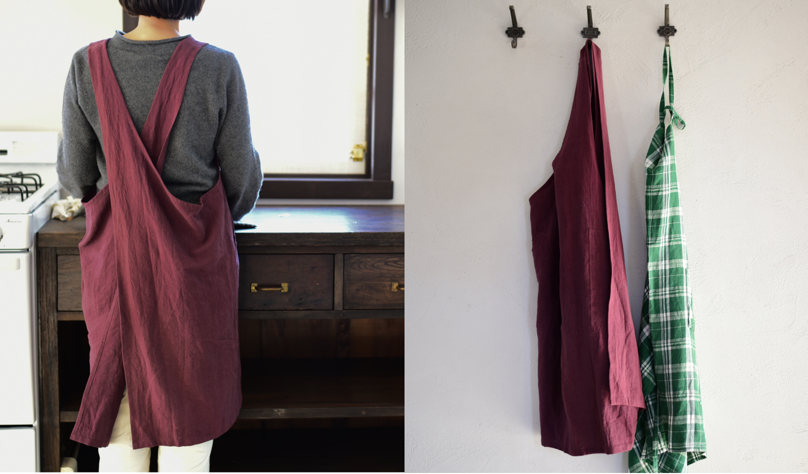 ボルドー色のお気に入りのエプロン。身にまとうと料理のスイッチが入る。 すっぽりと包み込んでくれる様なデザインで、着ているのを忘れるほど快適。