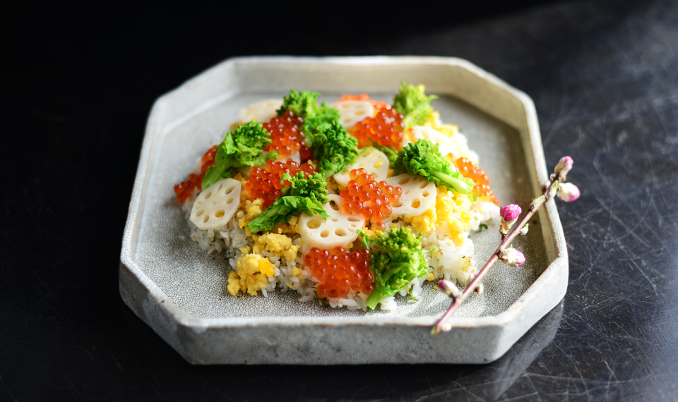 あとは菜の花や人参、卵などの華やかな彩りが食卓に春を呼んでくれるように盛り付けます。