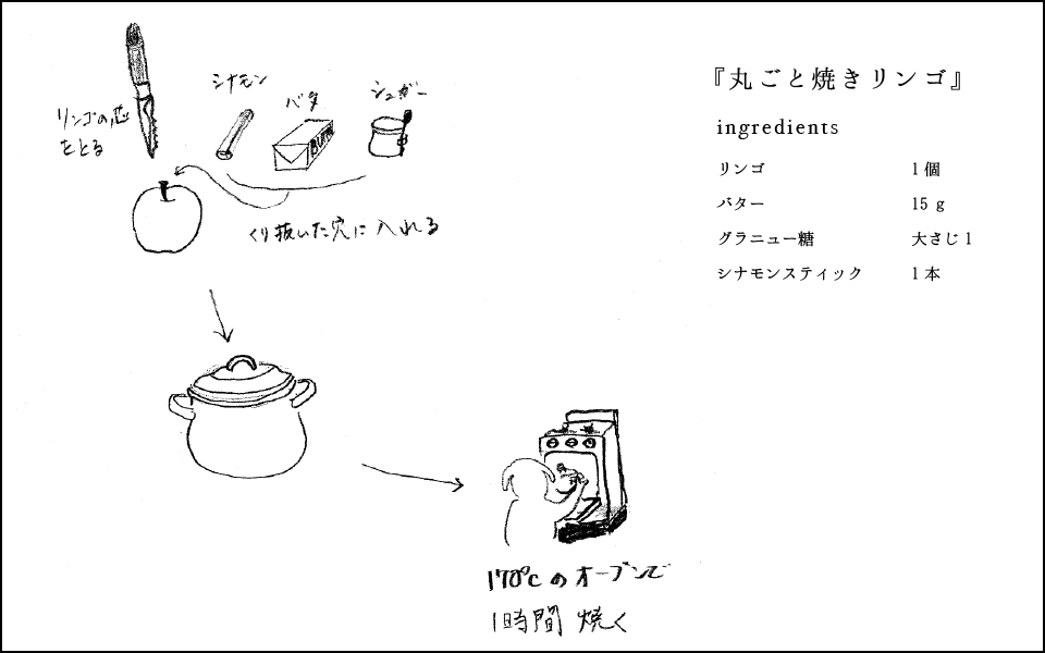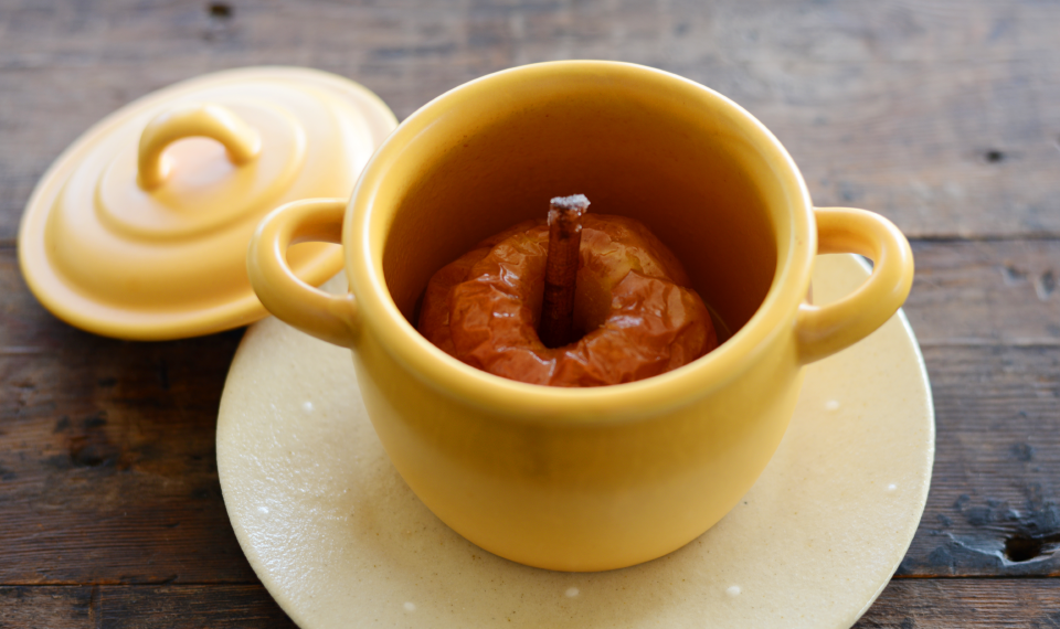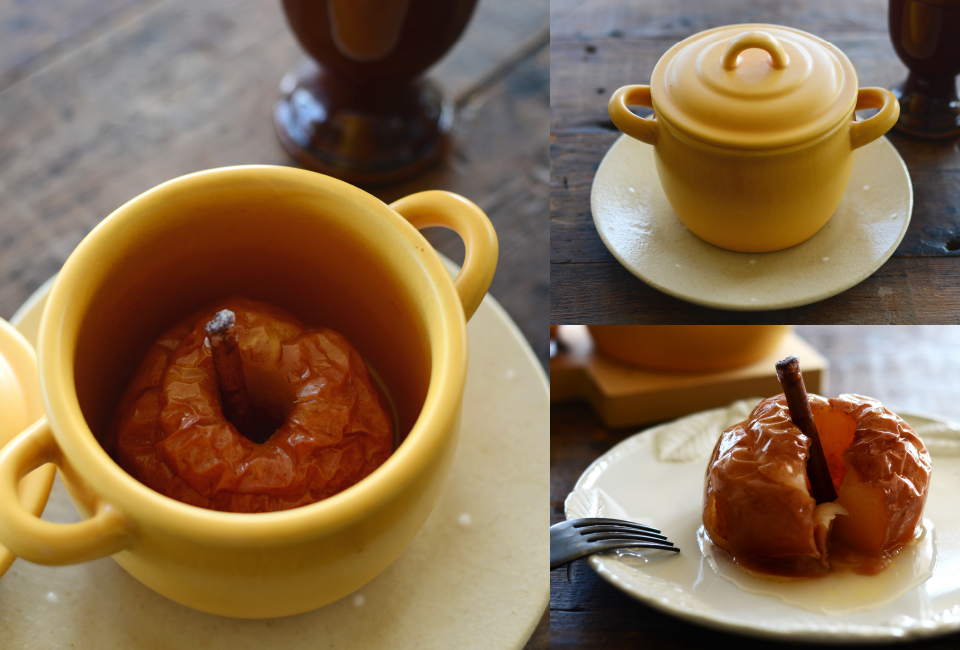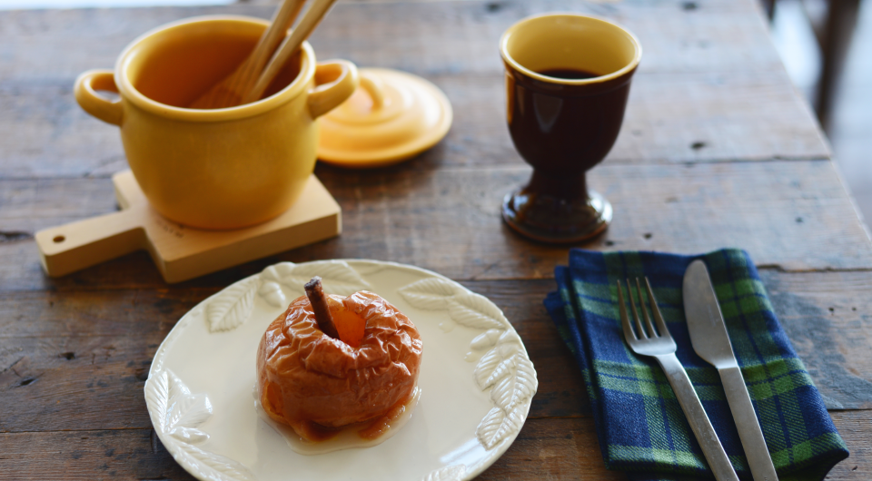 りんごは酸味の強い紅玉がおすすめで、火が通るのに時間がかかりすぎない小振りなりんごを選んで。 ちょっと古くなってしまったものでも、鍋とオーブンに任せておけばおいしくできます。 蓋をして焼き上げるのでしっとりと仕上がり、りんごやシナモンの香りが鍋全体にまわってとびきりの味に。 好みで柔らかく泡立てた生クリームやバニラアイスを添えて。