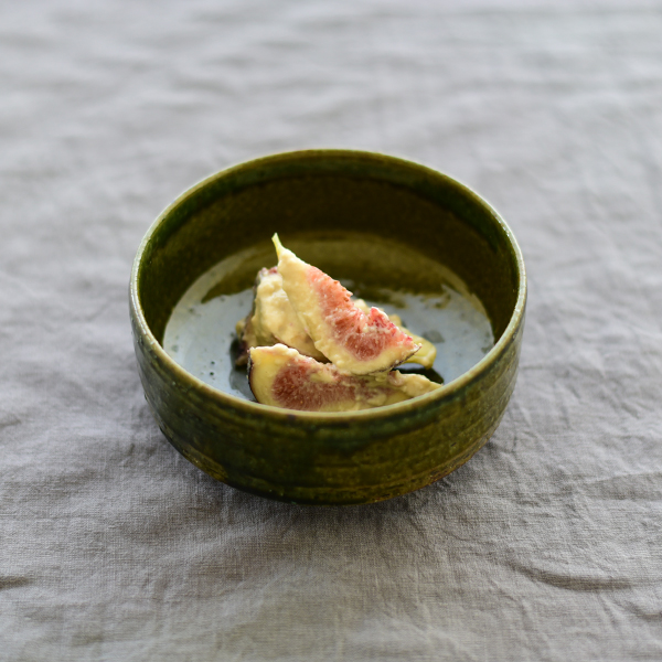 黒い器は土の凹凸感や、マットな黒色がいちじくの瑞々しさを際立たせます。 ラズベリー色の器は淡いいちじくの色との対比がきれいで ブラウンの絵柄の器は、大胆に入った絵柄がシックにいちじくを引き立てます。 表情豊かな織部の鉢は、渋いグリーンが料理を温かみのある印象に見せてくれます。
