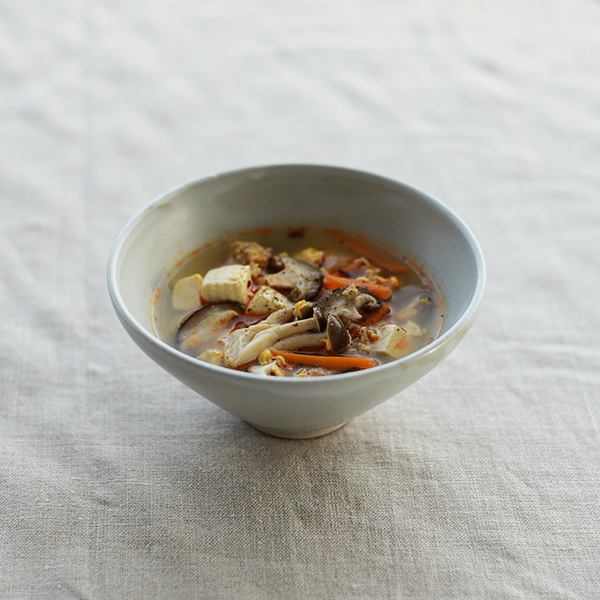 きのこをたっぷり使った酸味と辛味の効いたスープ