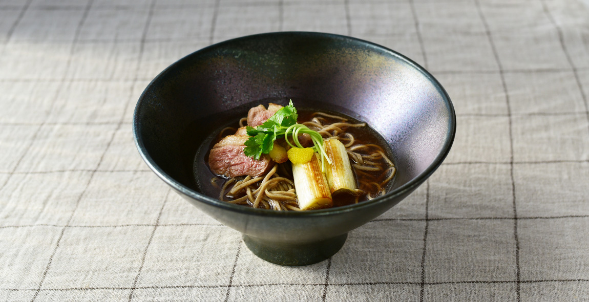 4.器にそばを持って、そばつゆを注ぎ、鴨肉、長ねぎ、三つ葉、柚子の皮を添える。