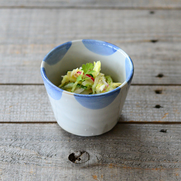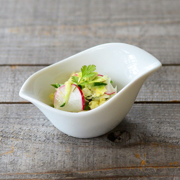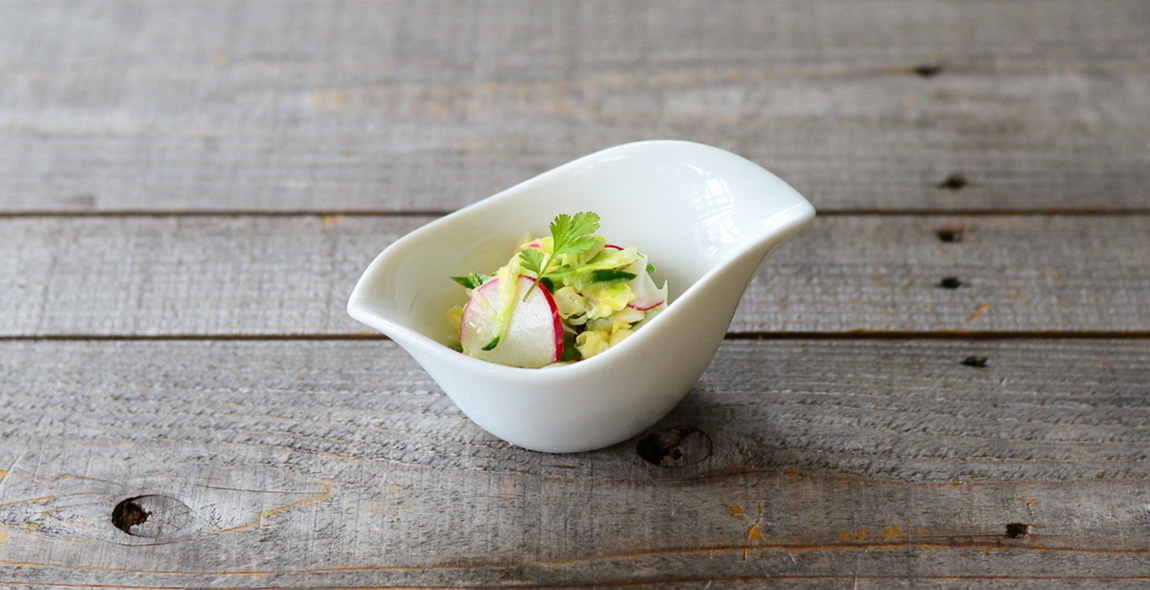 今回の器選びのポイントは形。どんな形の器を選ぶかで料理の印象が違ってきます。 シンプルな浅いボウルは使い回しがきき、安心感がありますね。 ひよこの様なふっくらとしたシルエットの小鉢は、料理をどこか可愛らしく見せてくれます。 リムが花びらのような小皿を使うと、華やかで印象的な一品に。 そば猪口を小鉢代わりに使うのも、夏らしさが感じられておすすめです。