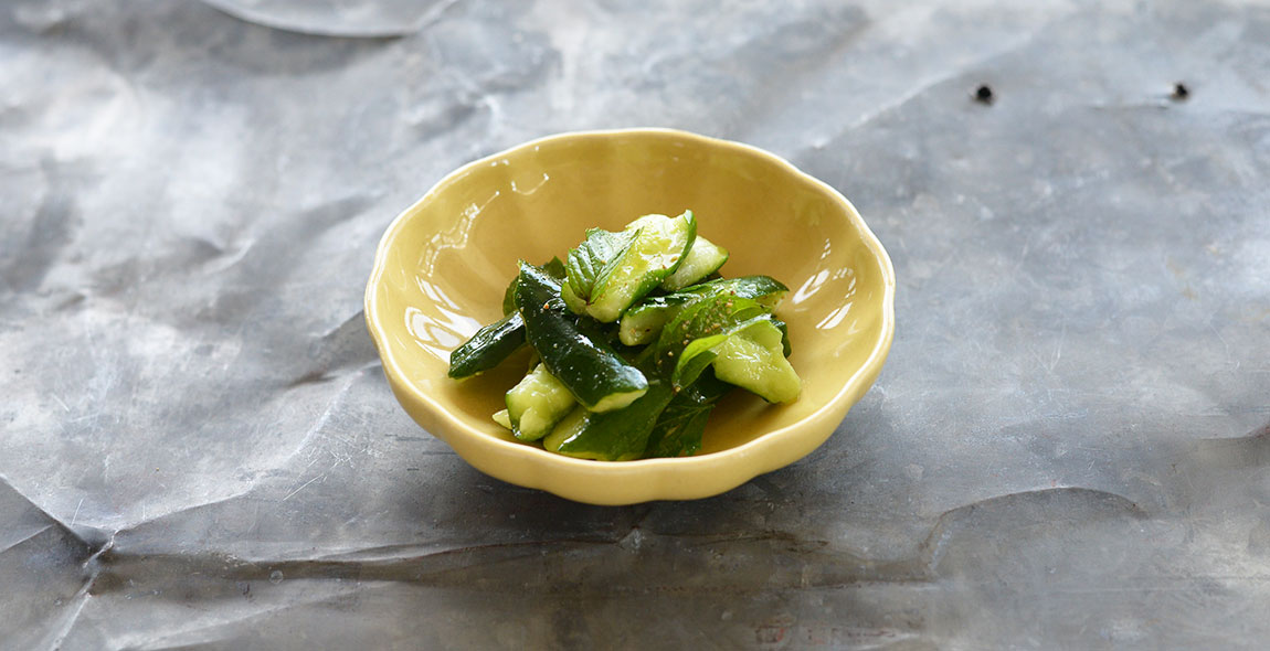 今回の器選びのポイントは色。どんな色の器を選ぶかで料理の印象が違ってきます。 ツヤのあるブルーグレーの器は、きゅうりの瑞々しさを一層引き立てて洗練された印象に。 鮮やかなパープルは夏らしくクールな雰囲気。爽やかなイエローは温かみがあり家庭的な感じがします。 光沢のある銀彩の器に盛れば、上品で高級感のある一皿に仕上げてくれます。