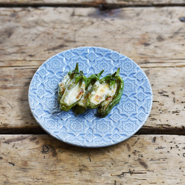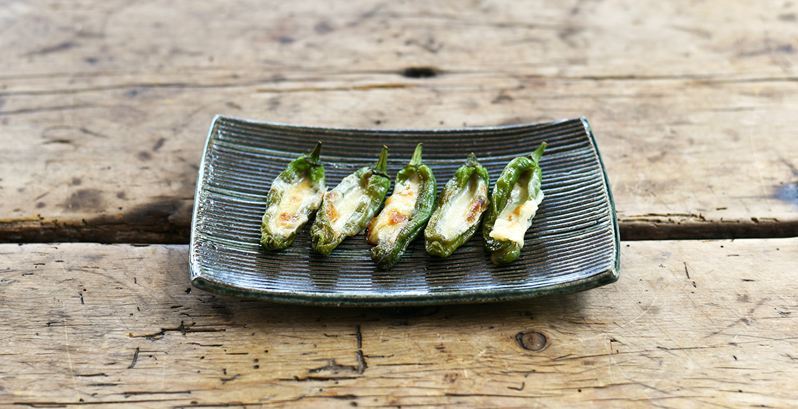 3.オーブントースターで切り込みを上にしたししとうを並べ、チーズがとけるまで焼く。