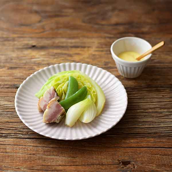 2.野菜とベーコンは食べやすいサイズに切り、蒸し器に入れて強火で5分程好みの固さに蒸す。