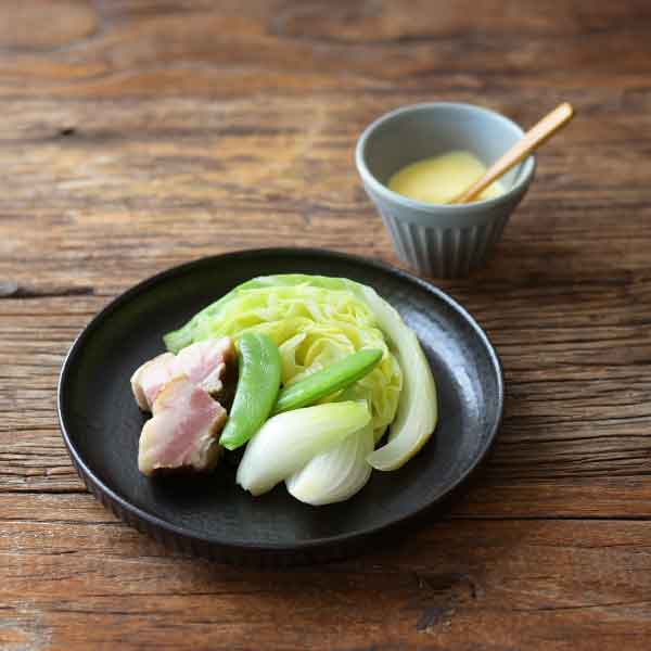 黒い深皿は素朴で趣があり、落ち着いた印象に。