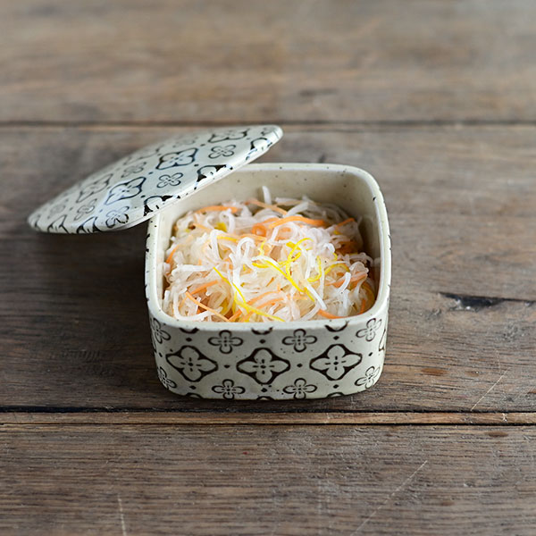 赤や黒の高台のある器に盛ると、ハレの日らしい凛とした印象に。 菱形の器や、小さなお重に入れると、古風で可愛らしい雰囲気が楽しめます。
