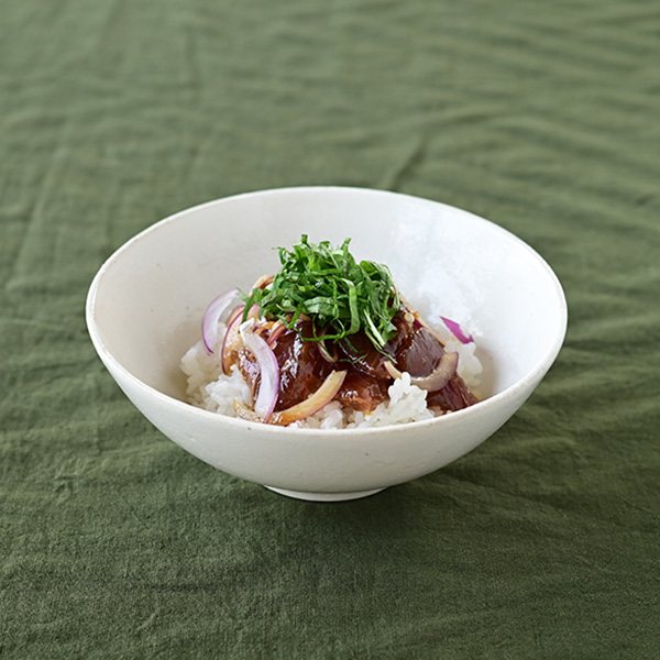 2.丼にごはんを盛りつけ、紫玉ねぎの薄切り、①のかつお、刻んだ大葉をのせる。