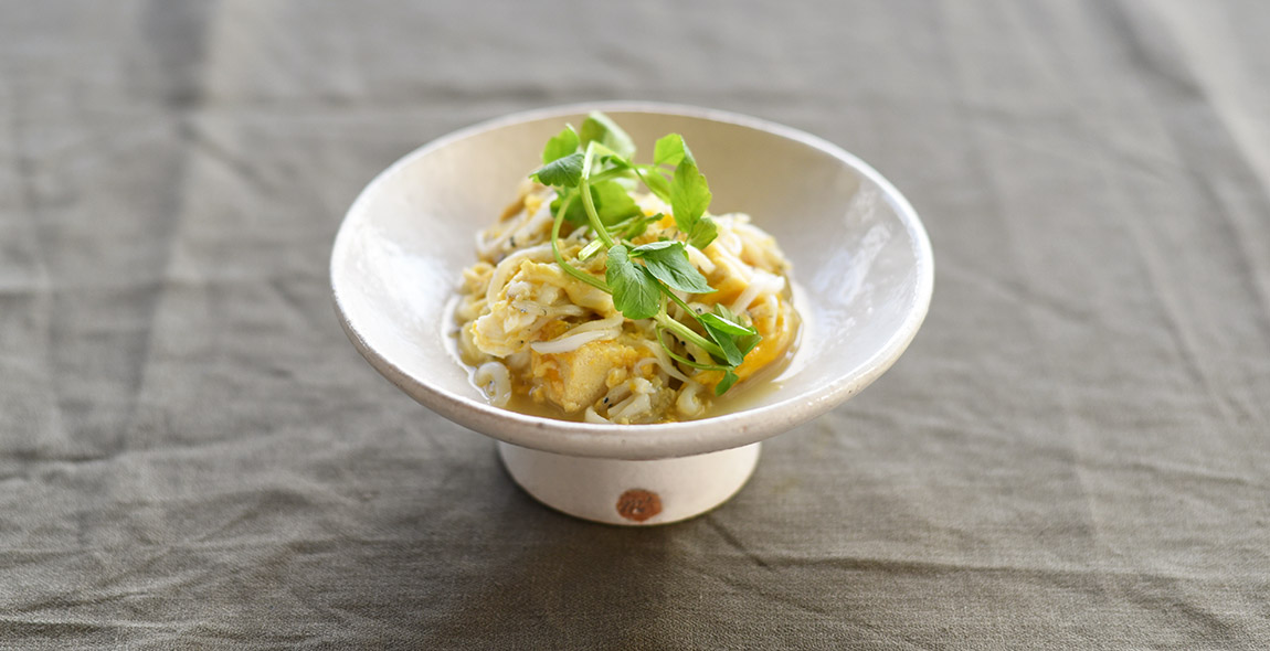 旬の白魚とせりを使った、早春の香りを感じる卵とじ。