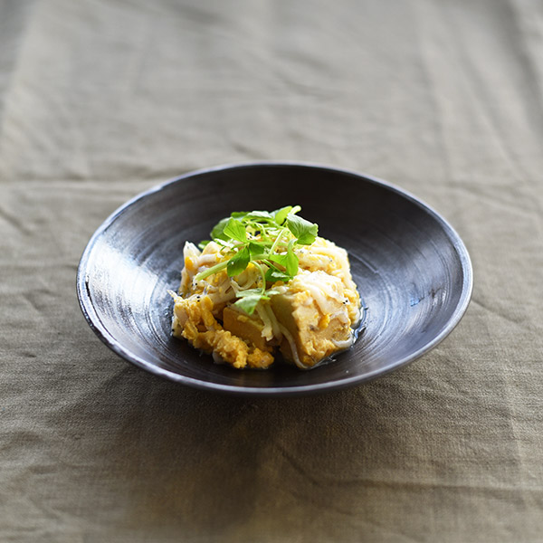 今回のポイントは器の技法。選ぶ器の印象で料理の見え方が違ってきます。 白い粉引の器に盛ると、柔らかで温かみのある印象に。 十草の鉢は手描きのラインが料理を生き生きと見せてくれます。 鮫肌状のかいらぎは、表情豊かで味わい深く 光沢のある黒柿釉の器は高級感、重厚感があります。