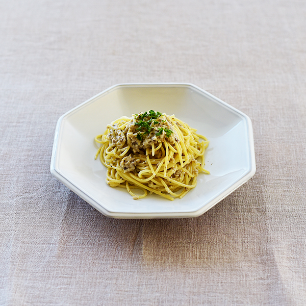 クリームパスタが引き立つ色の器を選びました