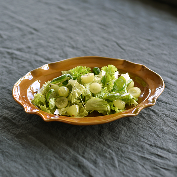 フラットな丸皿はモダンな印象。サラダを広げる様に盛りつけても楽しい。 アメ色のオーバル皿はぽってりとした厚みが、温かく穏やかな感じがします。 高台付きのボウルは高さがあり、テーブルの上を華やかで特別な雰囲気に。 花びらのレリーフが美しいボウルはサラダを優雅に見せてくれます。