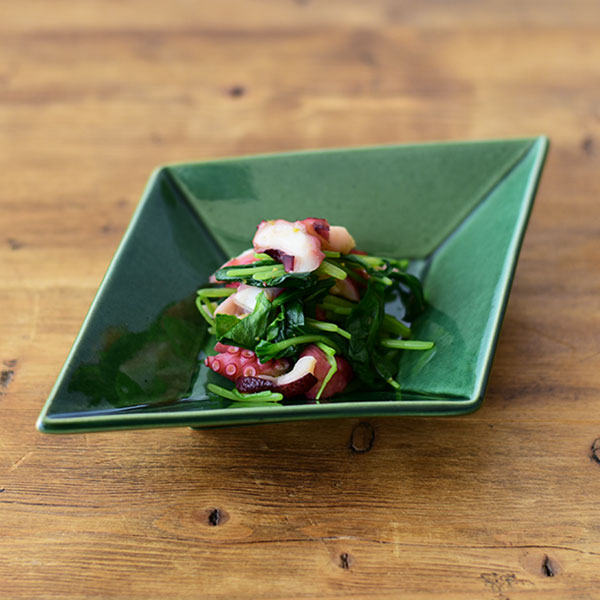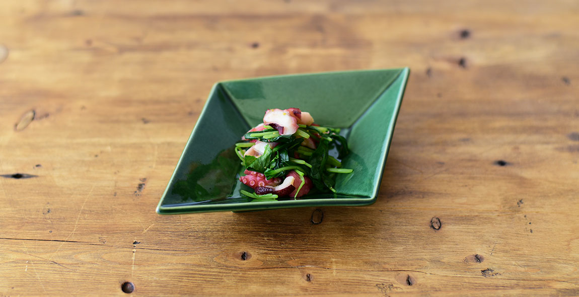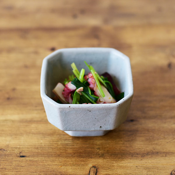 今回のポイントは形。選ぶ器の印象で料理の見え方が違ってきます。 角のとれた隅切り角の器は穏やかで凛とした雰囲気。 菱形の小鉢は自然と余白が生まれ、シャープで洗練された一品に。 シンプルな丸いボールとレリーフのある角鉢は、盛り面が小さく、広がるように立ち上がりのある形状。 何気ない料理も品良く見せてくれます。