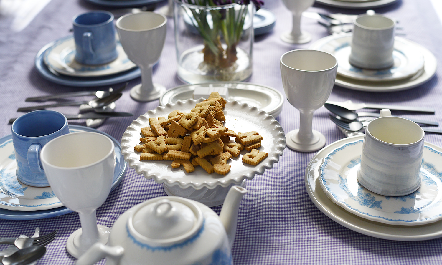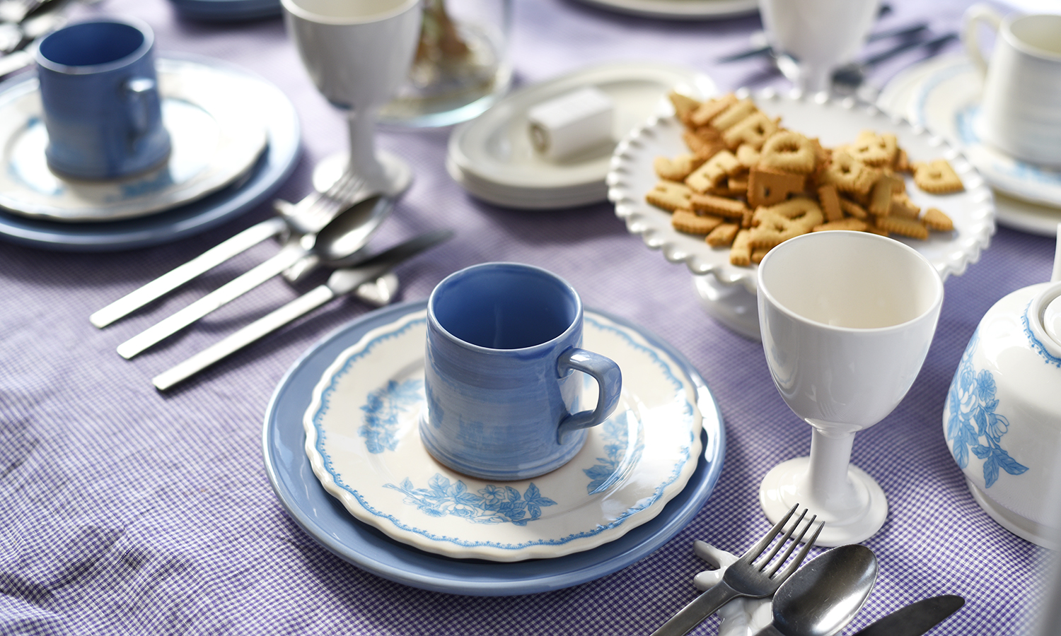 細かめのチェック柄にラベンダーの色合いが優しい印象の生地。合わせるのは上品な大人のラベンダー色と柔らかな白色が魅力のポフィネシリーズ。重ねるプレートは淡いブルーで描かれた薔薇が上品なスティルローズ。寒色系の淡いトーンでまとめたコーディネートは春の爽やかな風を運んできそう。ラベンダー色が大人の上品さを引き出す春のティータイム。