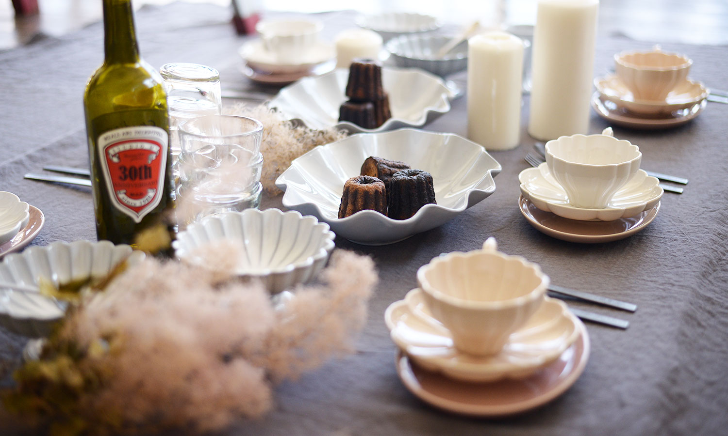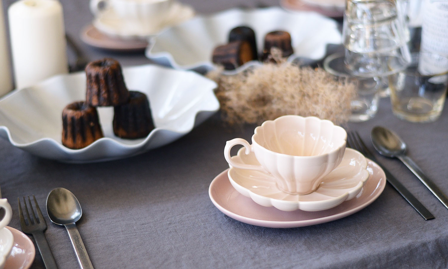ペイザンヌはフランス語で農民や田舎風という意味。おおらかな農民をイメージして作られたグレーの生地に、少し華やかなピンクのカップ&ソーサーとヴィンテージの空気感を纏った器たちで校正することで、シックながら華やかなティータイムになります。