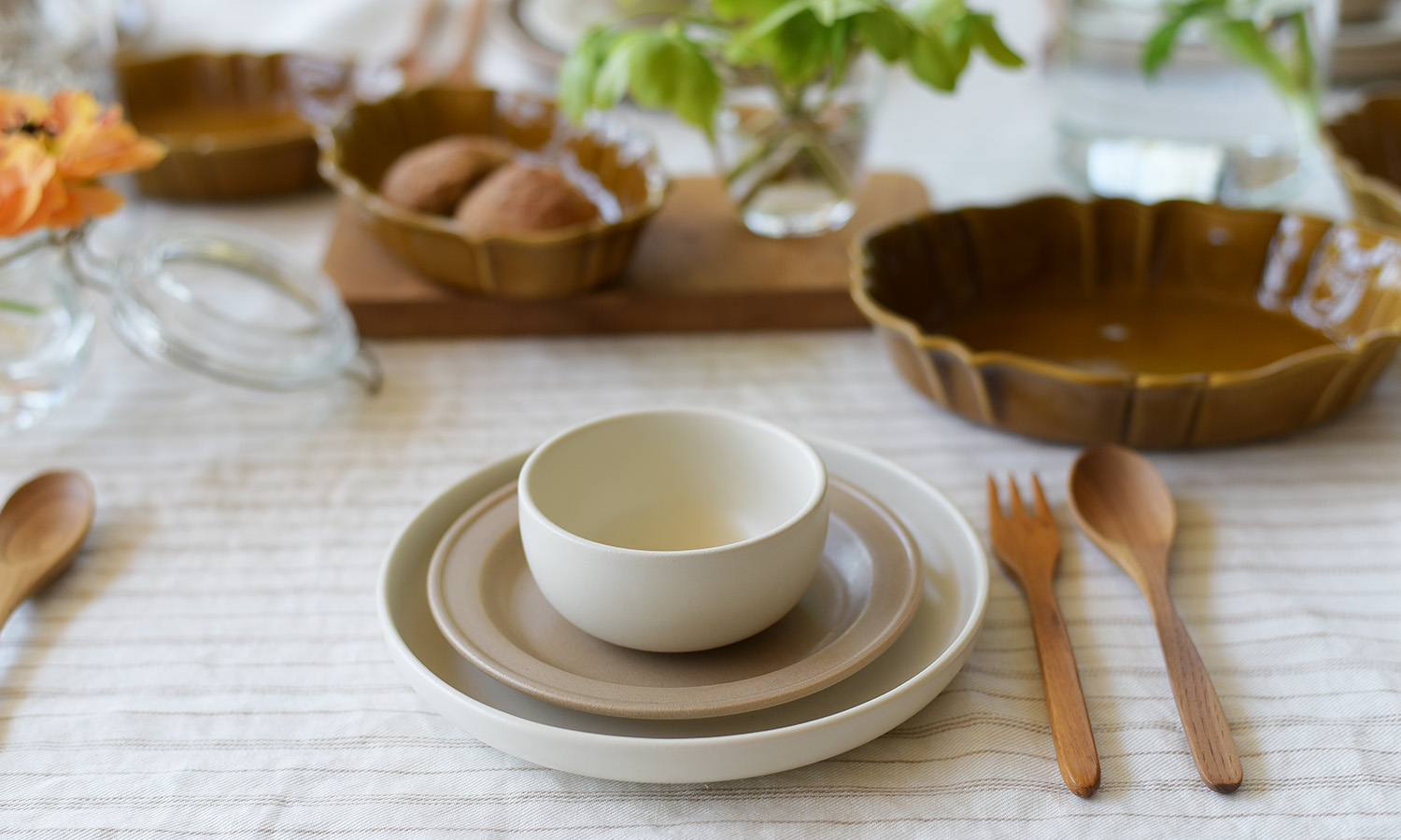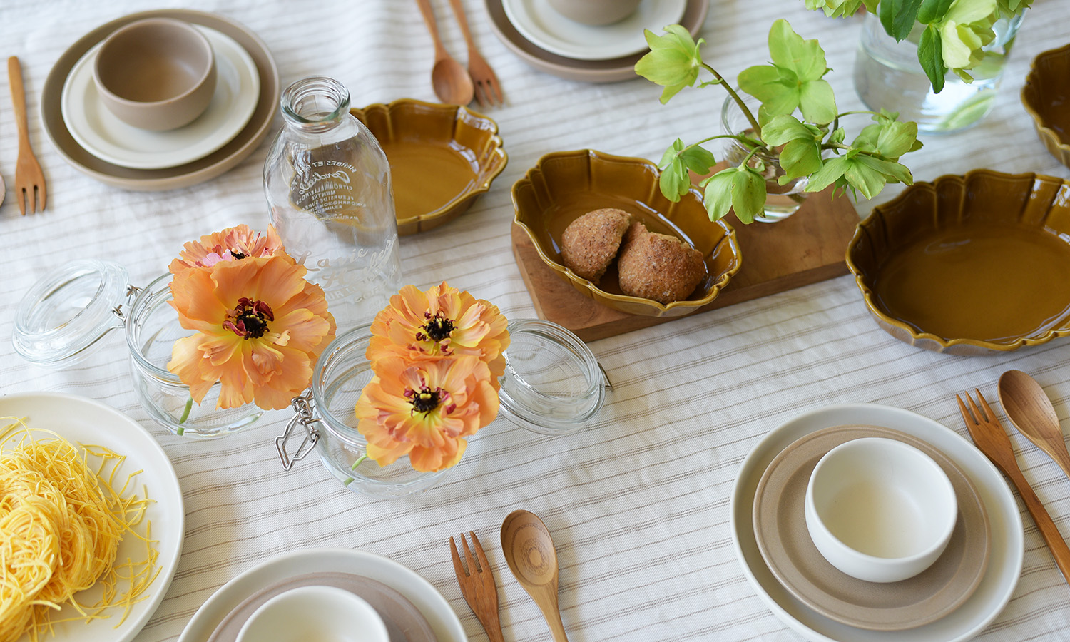 白糸をベースに、タテ糸は麻の生成色をそのまま生かした、自然な上品さを感じるブリュム。丸みのあるフォルムとマットな質感のパルードや、一年中使いたいエレガントなオーブンウェア、ラコットクルンプリが上品で優しい雰囲気を演出。ボリュームのある透明感のある色合いの花が、ランチを楽しむ大人の女子会を盛り立てる。